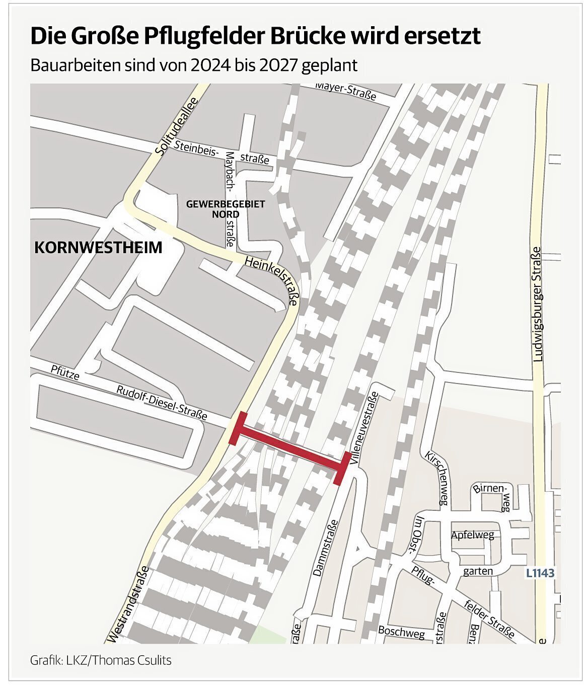 Kornwestheim –. Die 2020er Jahre werden als das Jahrzehnt des Brückenbaus in die Geschichte Kornwestheims eingehen. Wenn die Gumpenbachbrücke und der Bahndurchlass 2022 fertig sind, steht schon das nächste Großprojekt an: der Neubau der Großen Pflugfelder Brücke. Und das ist noch lange nicht das Ende.