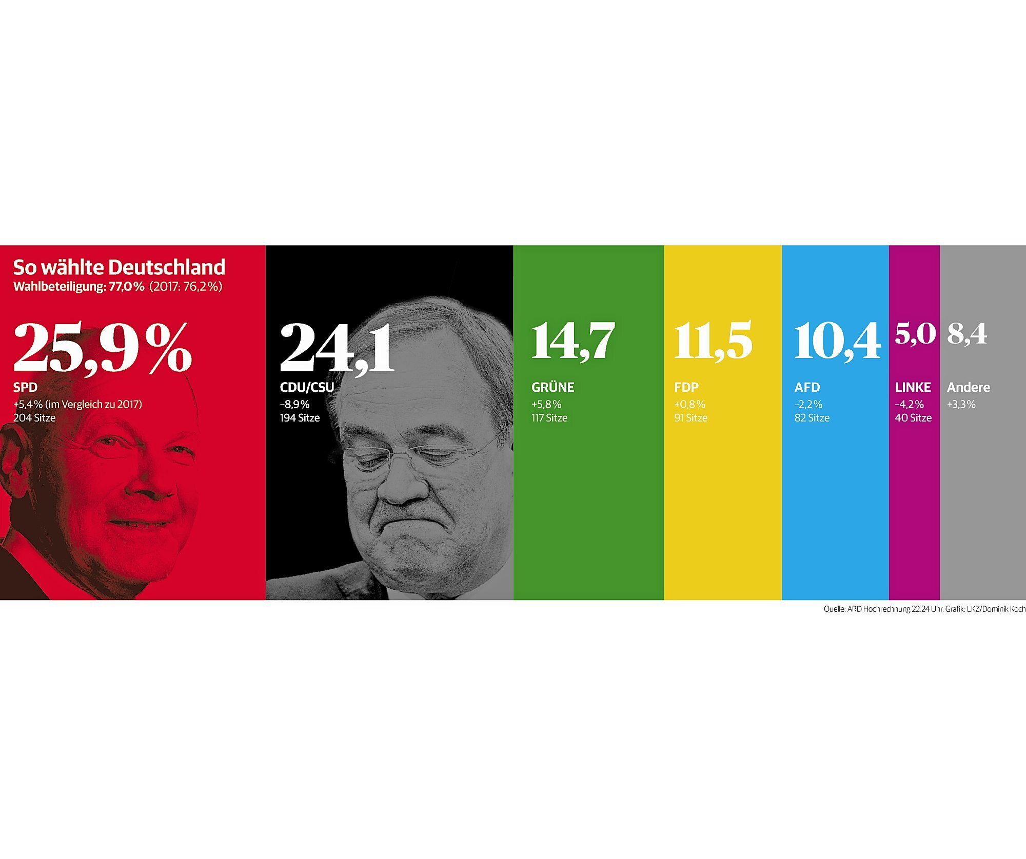 Berlin/Ludwigsburg. Deutschland steht vor einer schwierigen Regierungsbildung. Die Union ist bei der Bundestagswahl nach 16 Jahren Regierung von Kanzlerin Angela Merkel auf ein Rekordtief gestürzt und landete laut Hochrechnungen knapp hinter der erstarkten SPD. Sowohl SPD-Kanzlerkandidat Olaf Scholz als auch Unionskanzlerkandidat Armin Laschet reklamieren Regierungsauftrag und Kanzleramt nun für sich. Beide wollen am liebsten mit Grünen und FDP regieren.