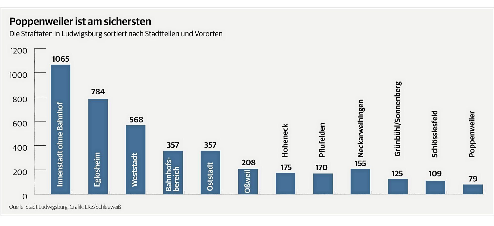 Laut Zacherle gibt es keine kriminellen Brennpunkte in der Stadt. Die Sortierung der Straftaten nach Stadtteilen ergibt für ihn keine Auffälligkeiten. Die meisten Vergehen werden aus der Innenstadt gemeldet. Gefolgt von Eglosheim und der Weststadt. Am sichersten ist Poppenweiler mit lediglich 79 Straftaten in 2020.