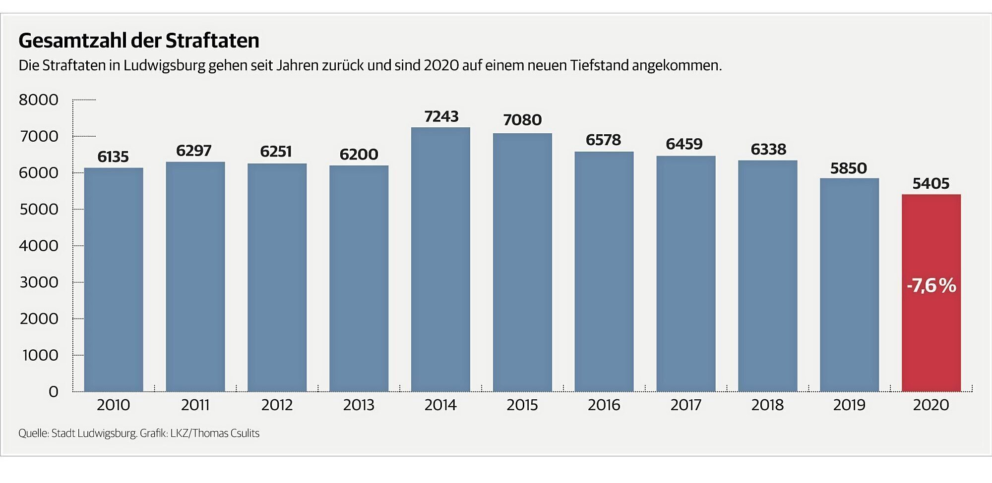 Ludwigsburg. Der Trend zu rückläufiger Kriminalität hält an. Nach einem Höchststand von über 7200 Straftaten im Jahr 2014, ist die Zahl seither immer weiter gesunken auf nun 5405 in 2020. Diese guten Nachrichten hat der neue Leiter des Ludwigsburger Polizeireviers, Christian Zacherle, jetzt den Stadträten präsentiert.